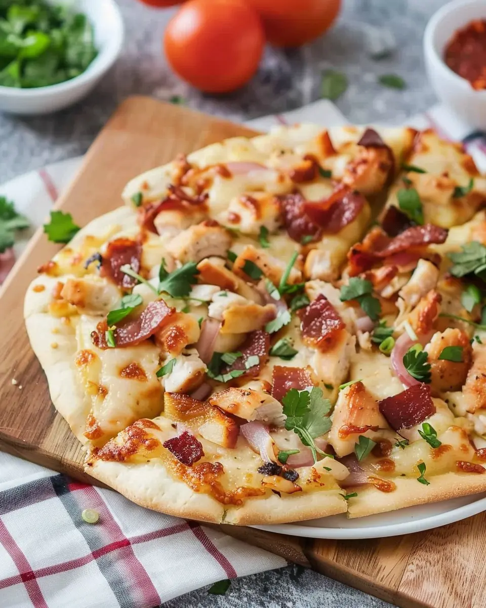 - Top with shredded chicken, crumbled turkey bacon, mozzarella cheese, cherry tomatoes, and red onion.