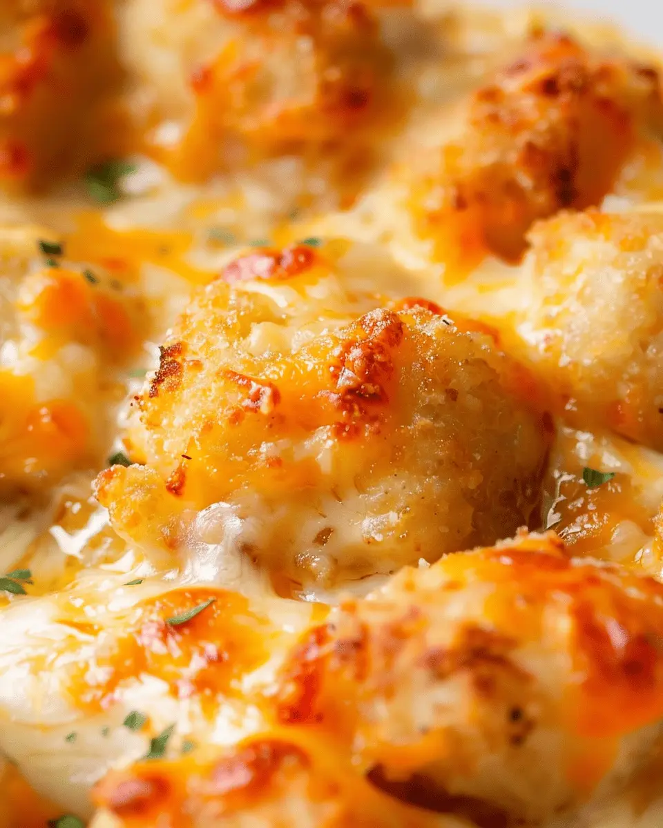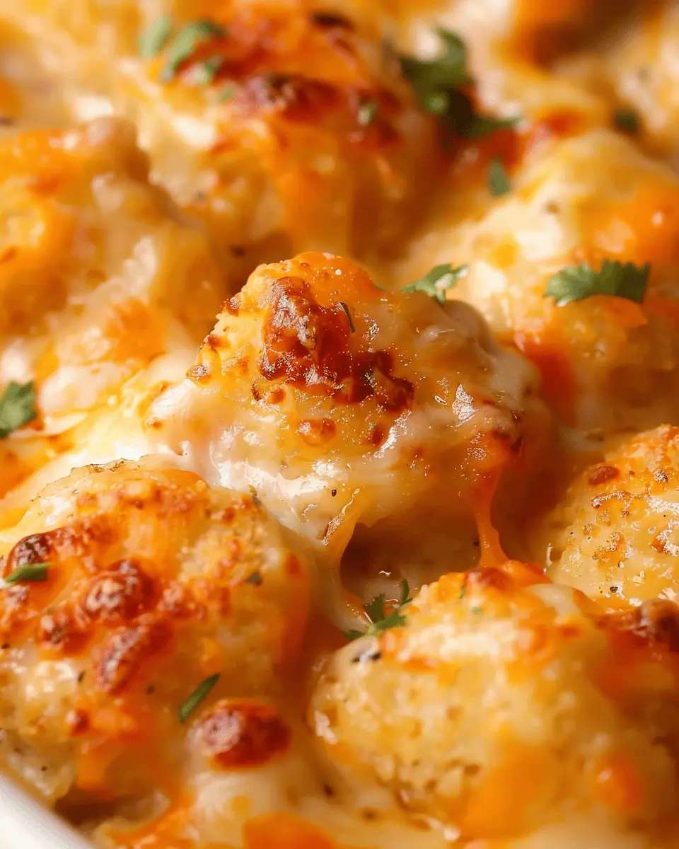 A creamy and cheesy casserole featuring crispy tater tots, savory turkey bacon, and delicious chicken ham, perfect for any meal.