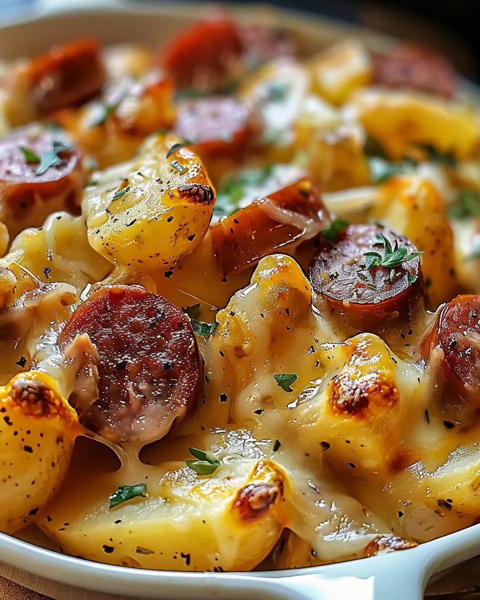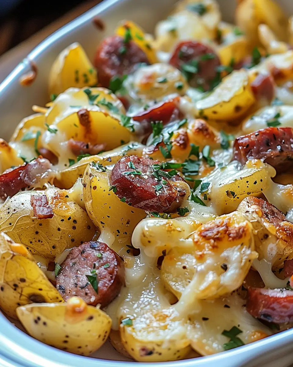 A delicious and easy recipe for cheesy ranch potatoes combined with smoked sausage, perfect for a comforting meal.
