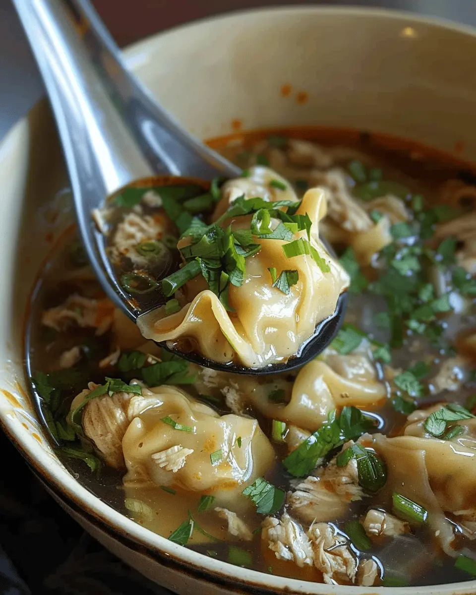 After everything is cooked through, it’s time to combine and finalize your Chicken and Wonton Soup. Stir the wontons and chicken thoroughly into the broth, then let simmer for an additional 2–3 minutes.