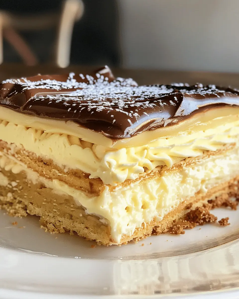 Finally, indulge in the chocolate ganache that crowns your Éclair Cake: