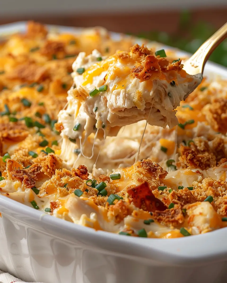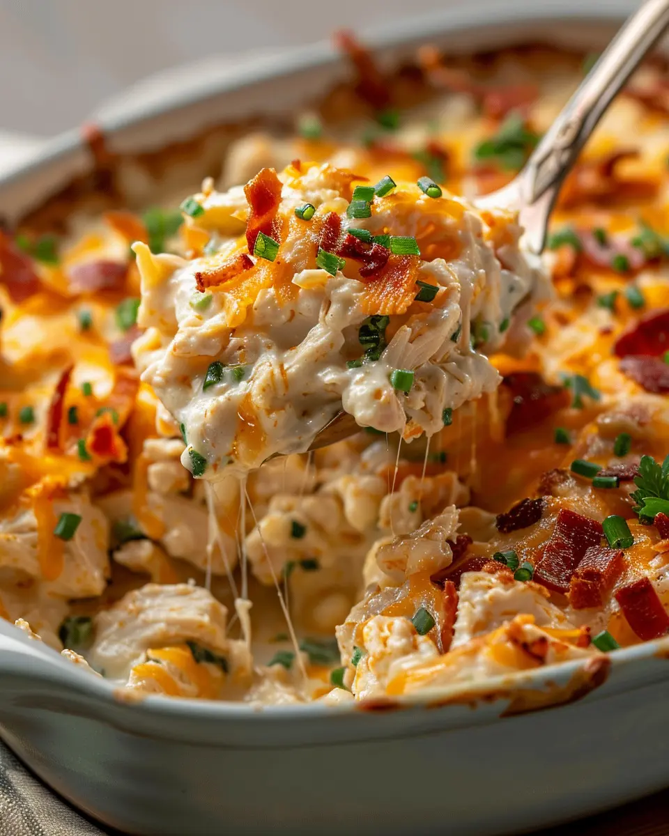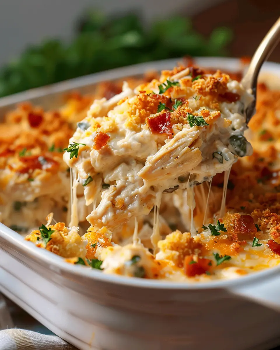 A delicious and comforting casserole made with tender chicken, savory turkey bacon, and rich flavors. Perfect for a cozy meal!