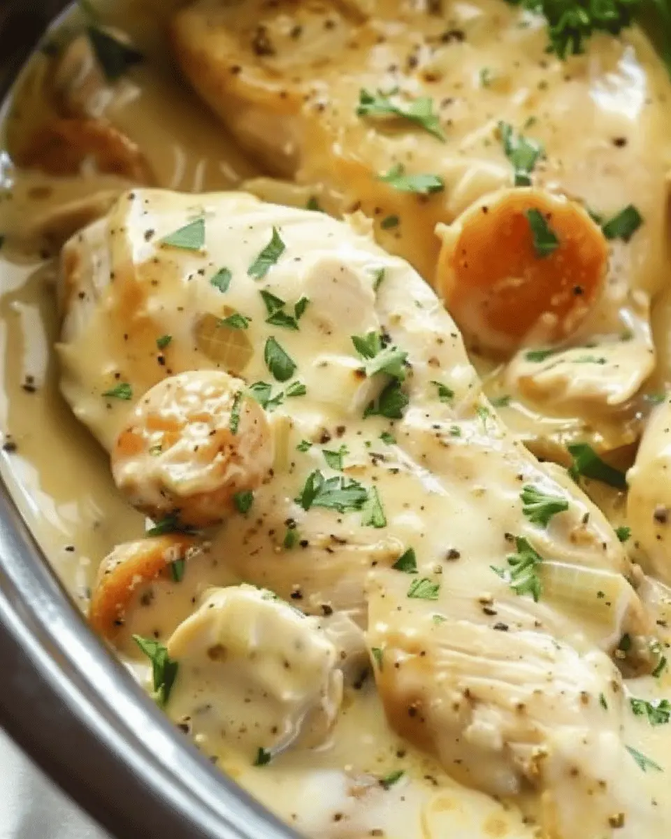 When the time is up, shred the chicken directly in the pot, mixing it with the creamy sauce and vegetables. Serve over rice or pasta for a wonderfully comforting dish.