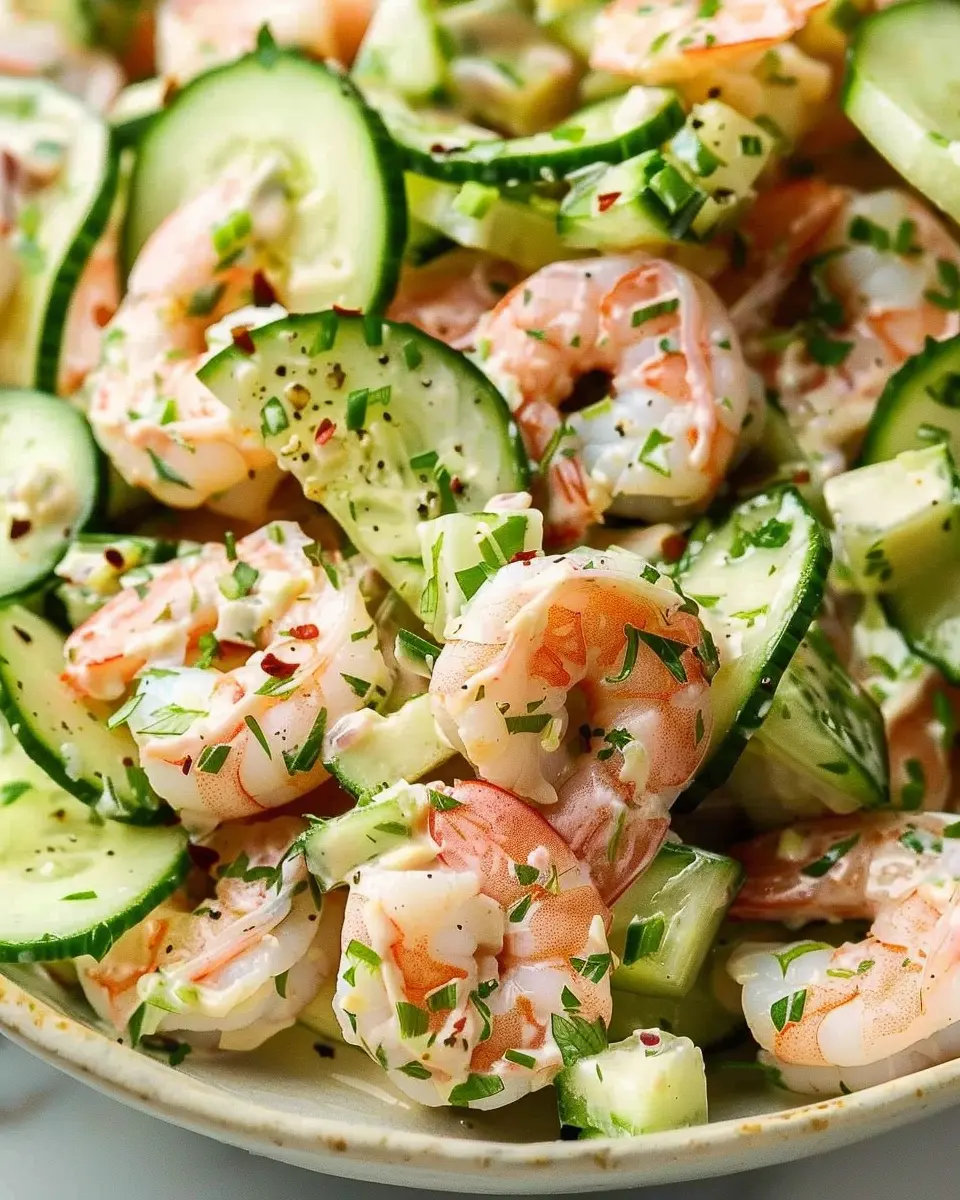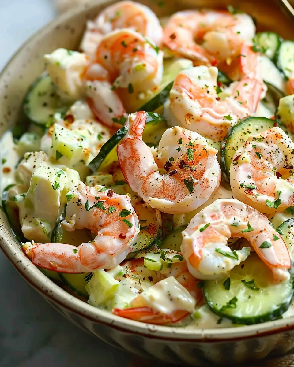 A light and refreshing salad featuring shrimp and cucumbers in a creamy dressing.