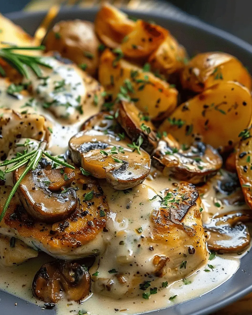 Keywords: Creamy Mushroom Garlic Chicken Alfredo, Hot Honey Roasted Potatoes