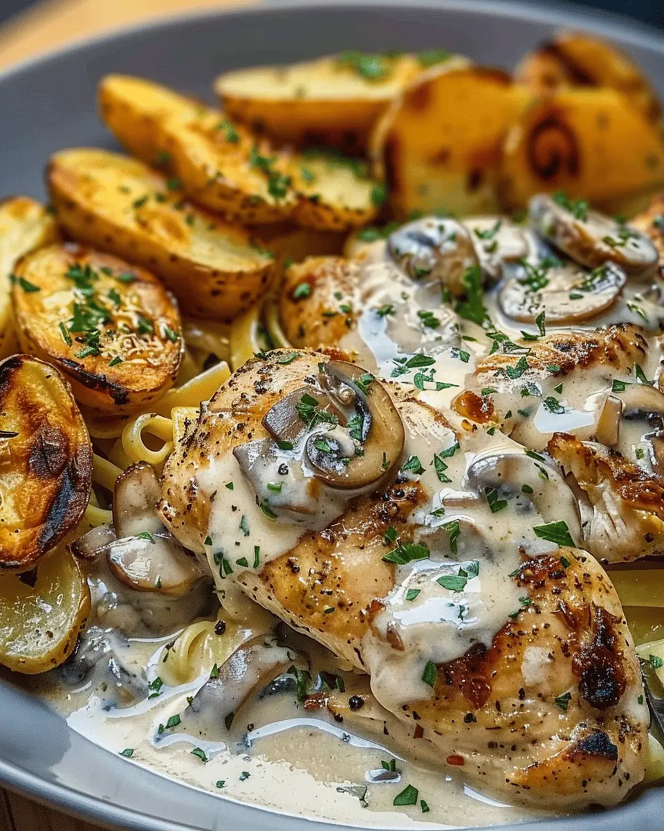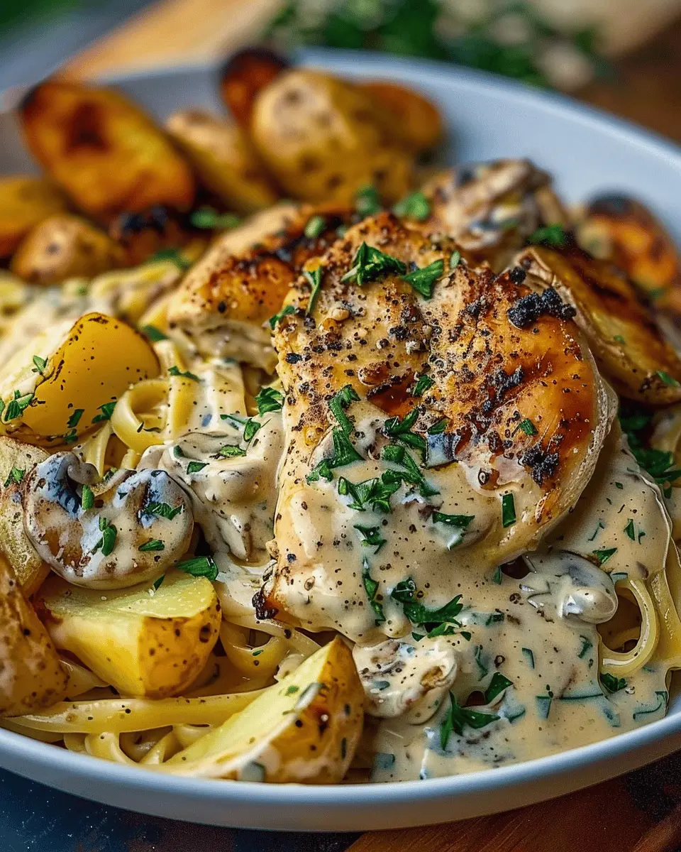 Creamy Mushroom Garlic Chicken Alfredo with Hot Honey Roasted Potatoes