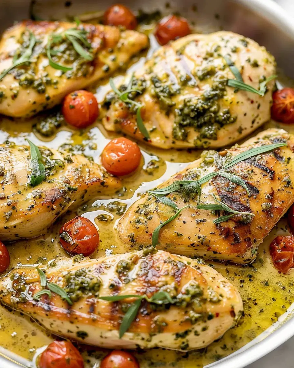 Presentation matters! Plate your creamy pesto chicken on a bed of herbs for added color. Garnish with a sprinkle of grated Parmesan and a few cherry tomatoes for a pop of freshness. Use a large, flat plate to make your dish look more refined.