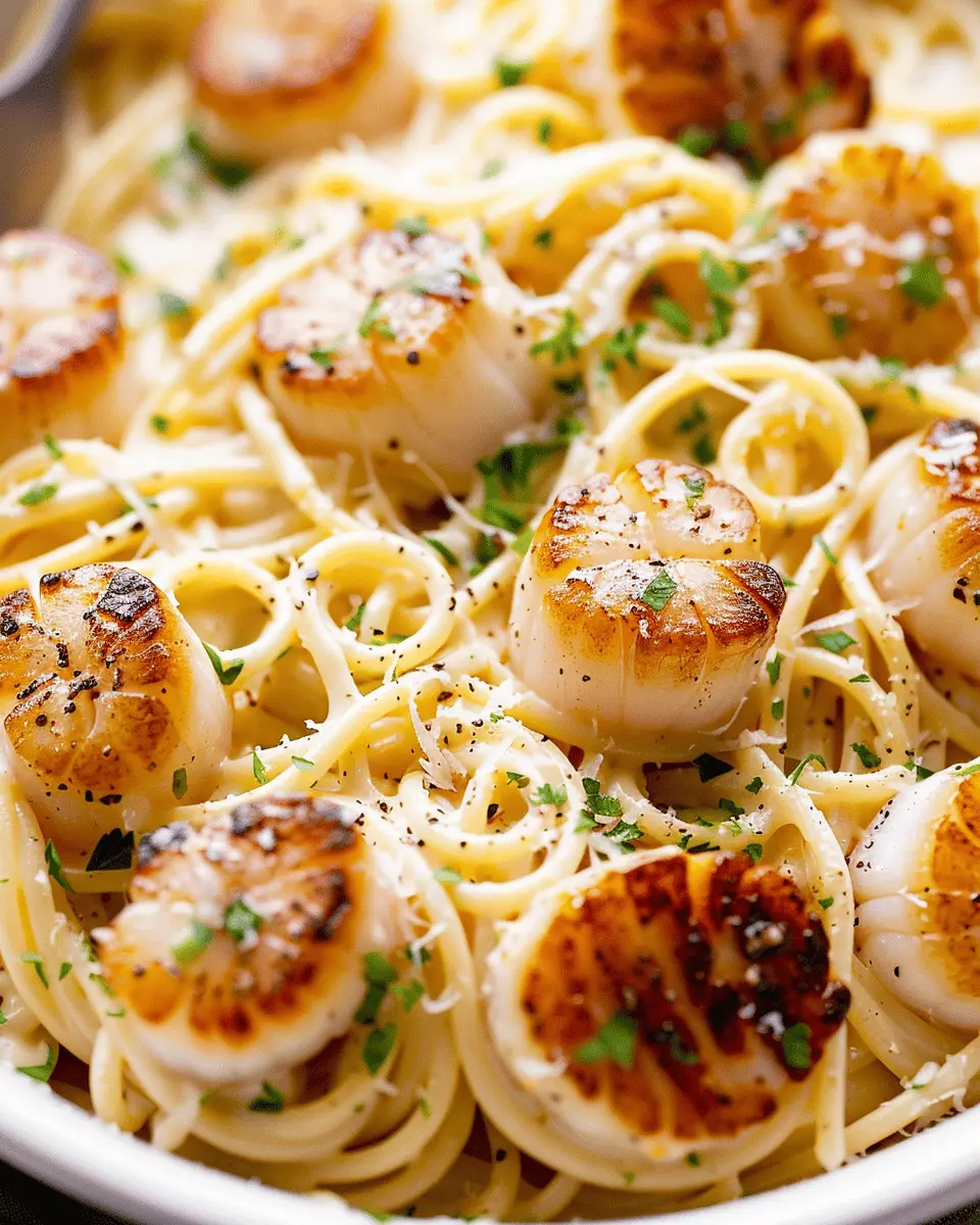 PrintCreamy Scallop Pasta: An Indulgent Twist with Turkey Bacon
