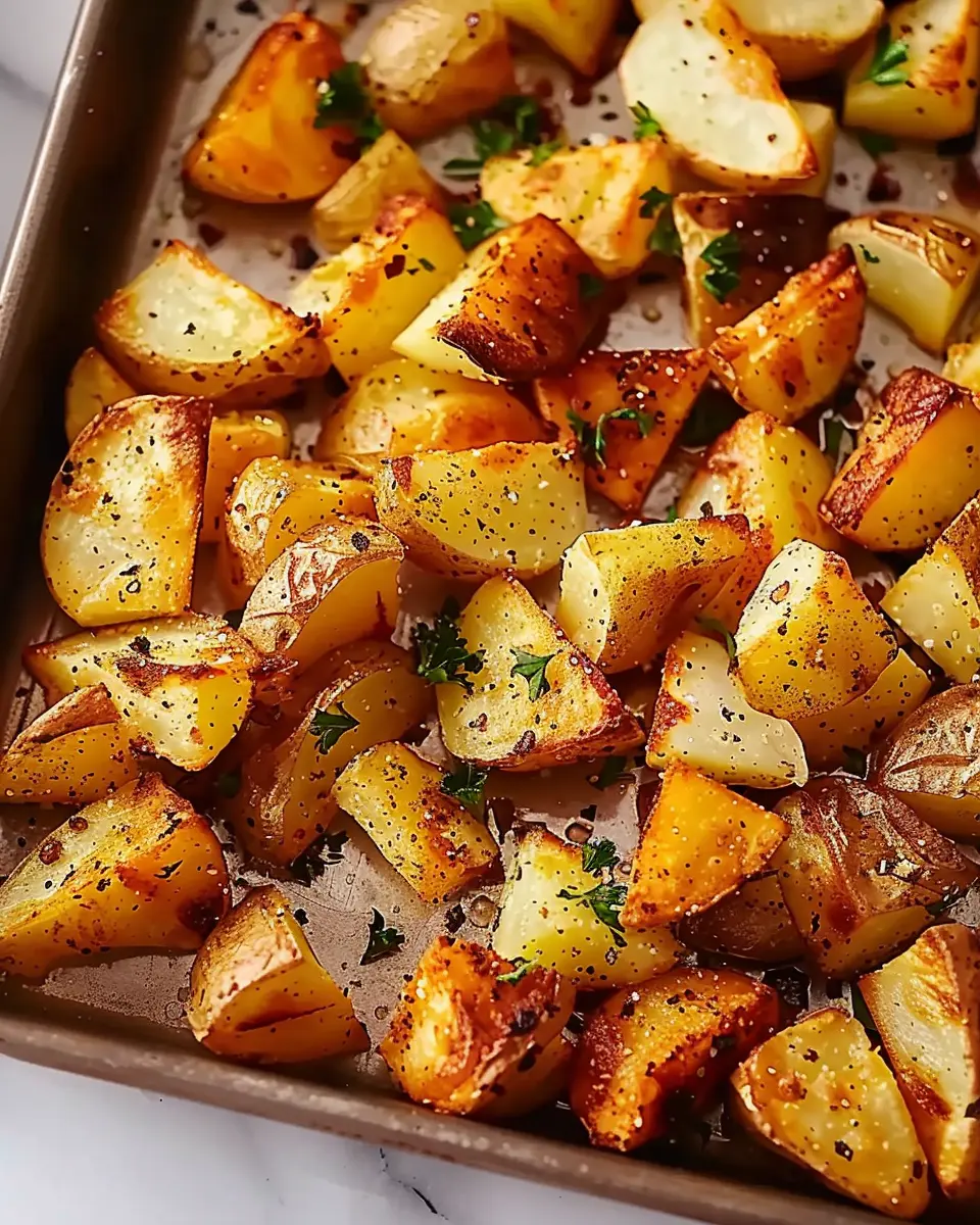 Once your potatoes are perfectly golden and crispy, remove them from the oven and let them cool for a few minutes on the baking sheet. This waiting period allows them to crisp up just a tad more while preventing you from burning your fingers.
