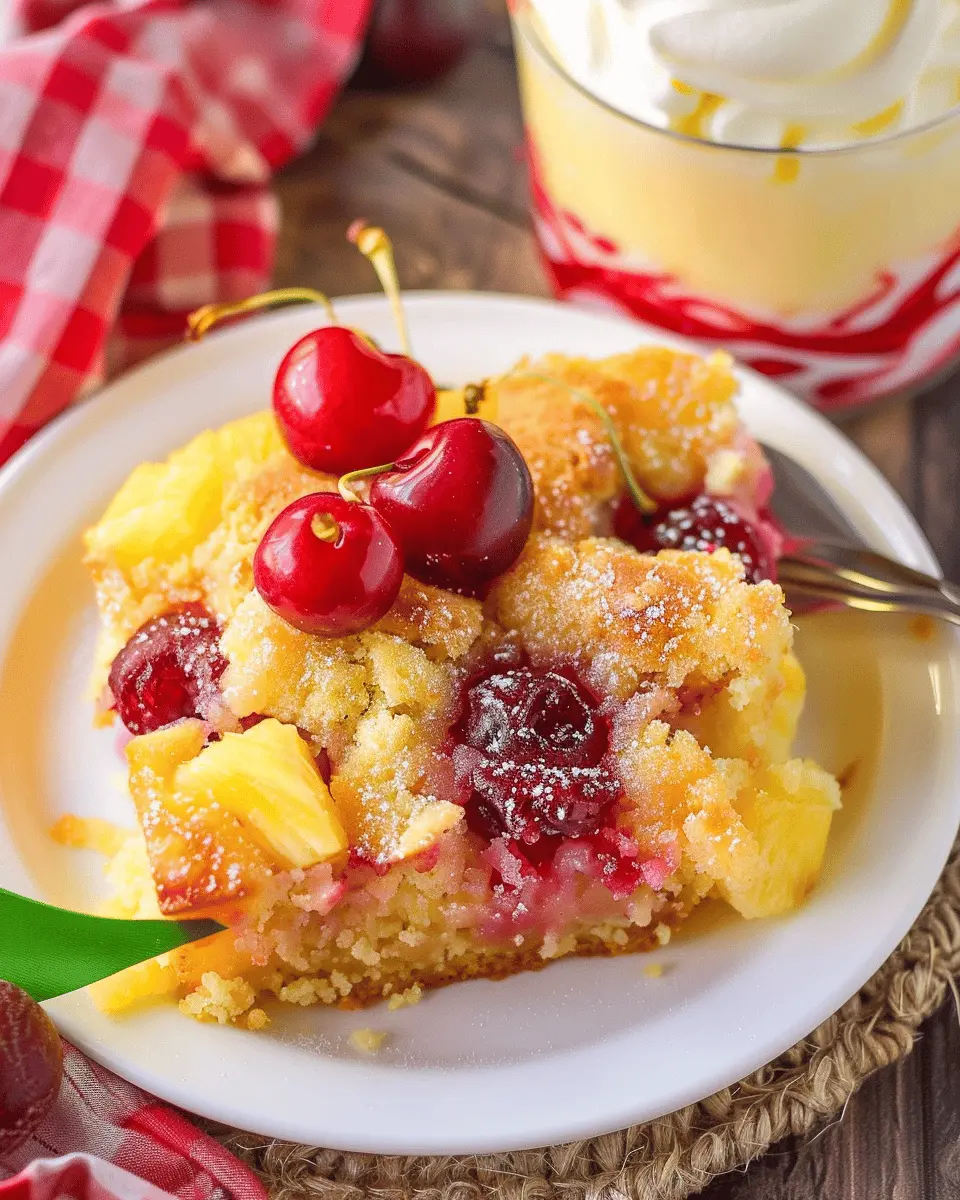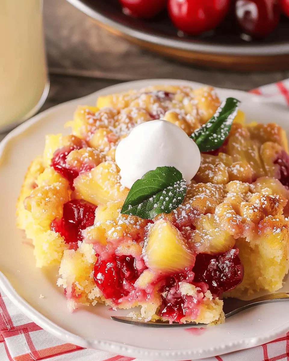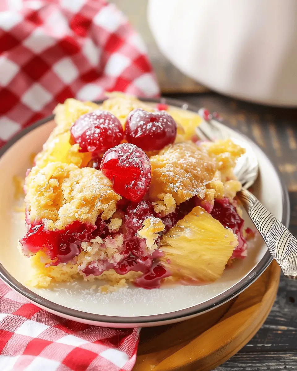 Indulge in the deliciousness of this Crockpot Cherry Pineapple Dump Cake, a simple yet satisfying dessert.