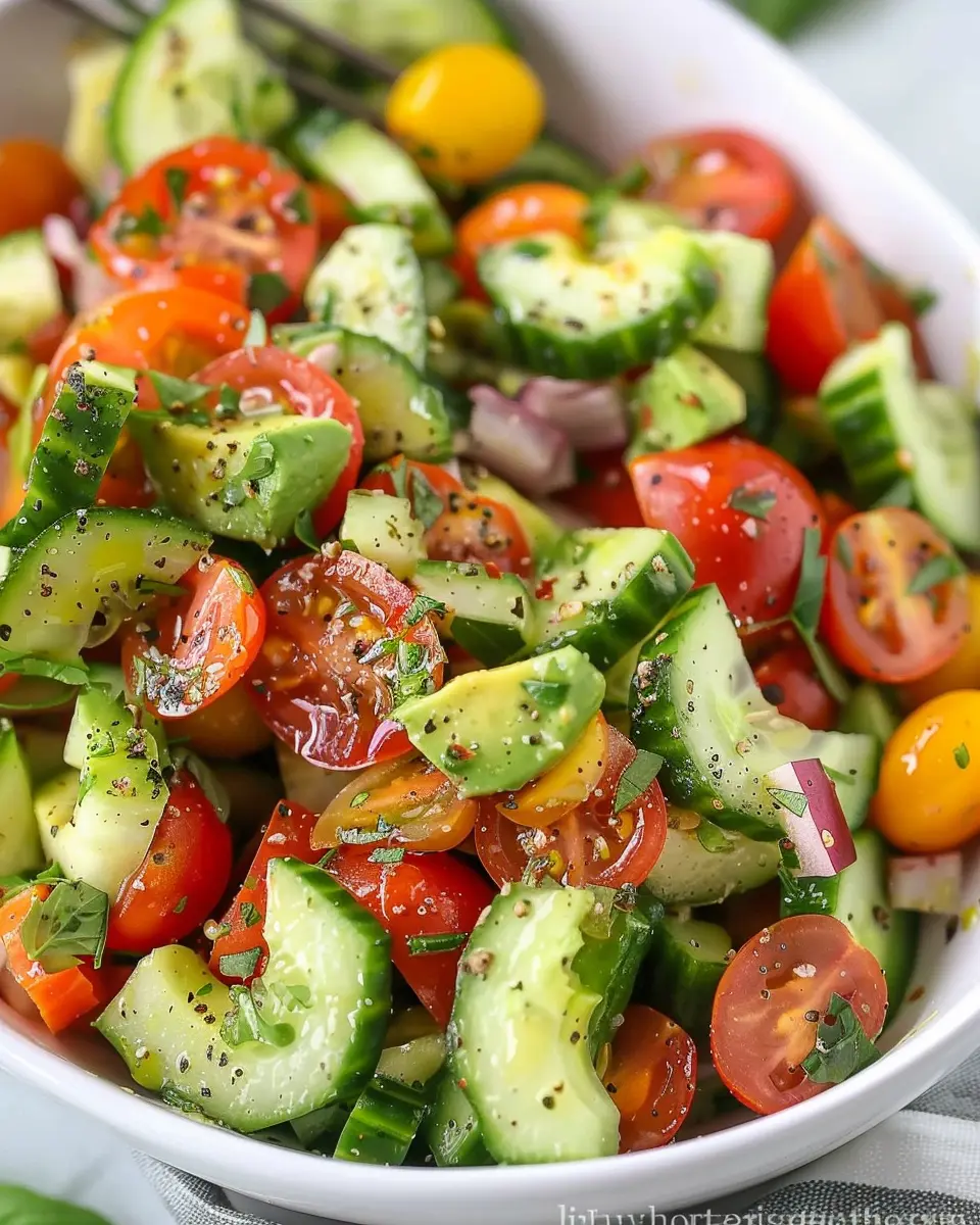A refreshing and healthy salad combining cucumbers, tomatoes, and avocado.