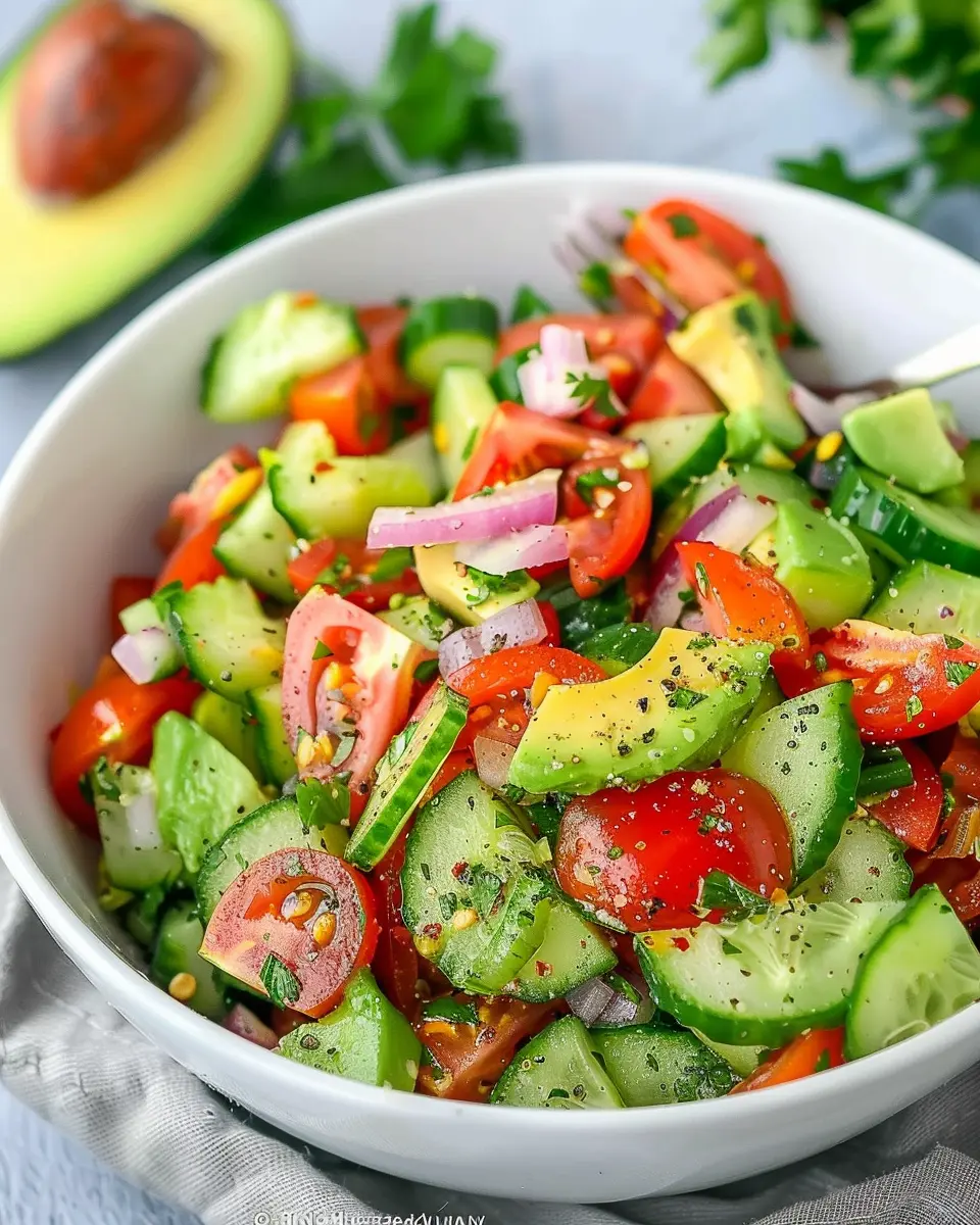 Imagine wrapping up a hectic day with this salad—you’ll have a delightful balance of flavor from ripe tomatoes, crisp cucumbers, and creamy avocados. Whether you’re prepping for a lunch at the office or a cozy weeknight dinner, this recipe is a fantastic option. Why not give it a try and discover your new favorite go-to meal?