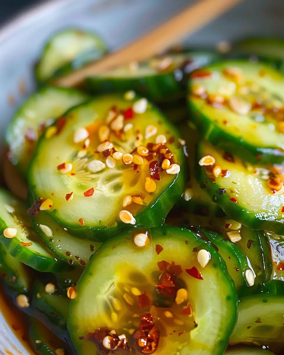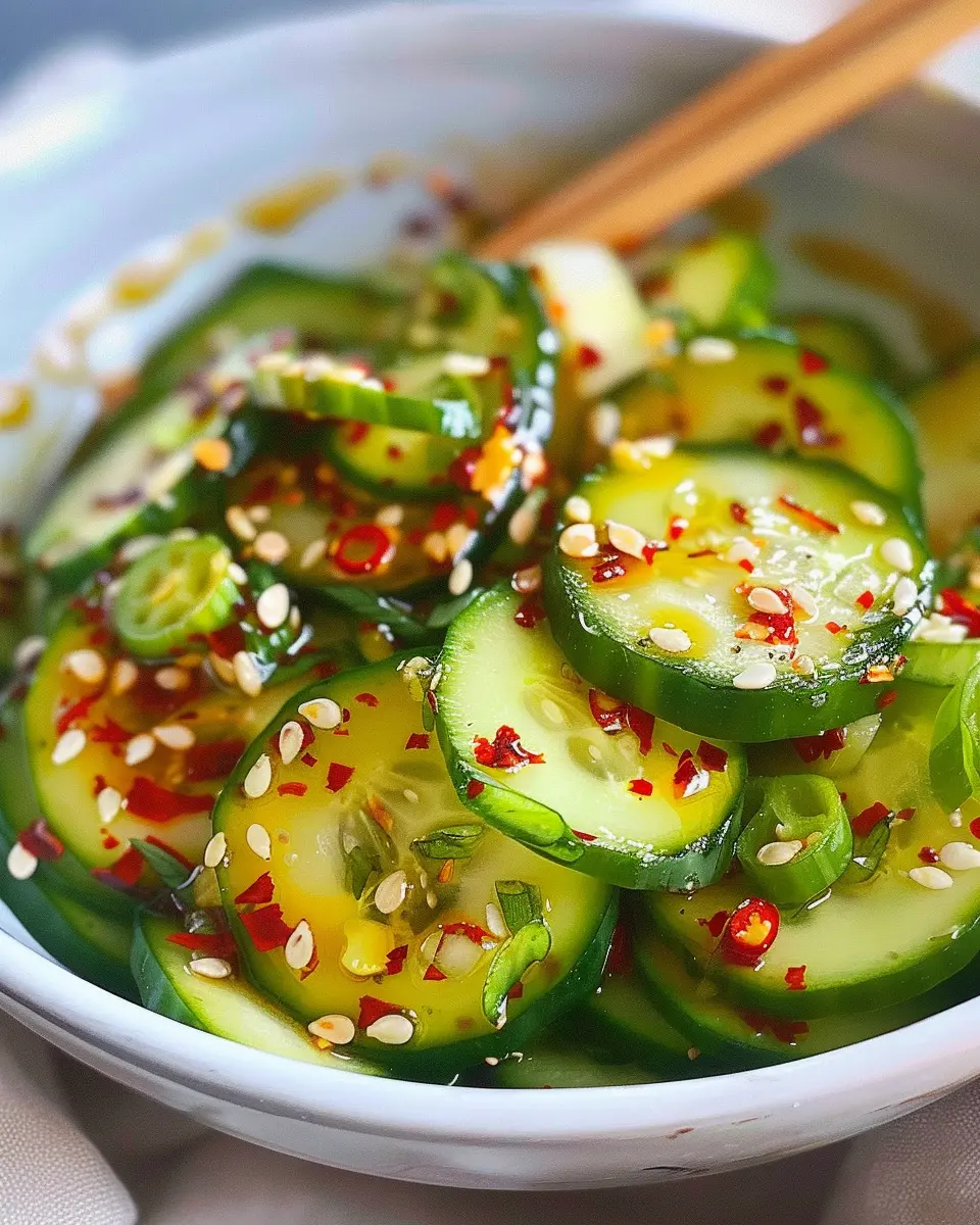 • Gently toss to ensure every piece of cucumber is well-coated with the flavorful dressing. You can also add some sliced green onions or chopped cilantro for an extra layer of freshness.