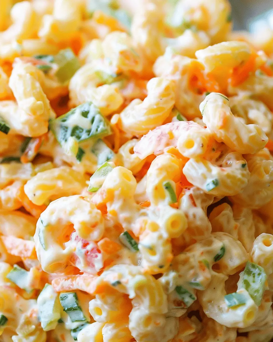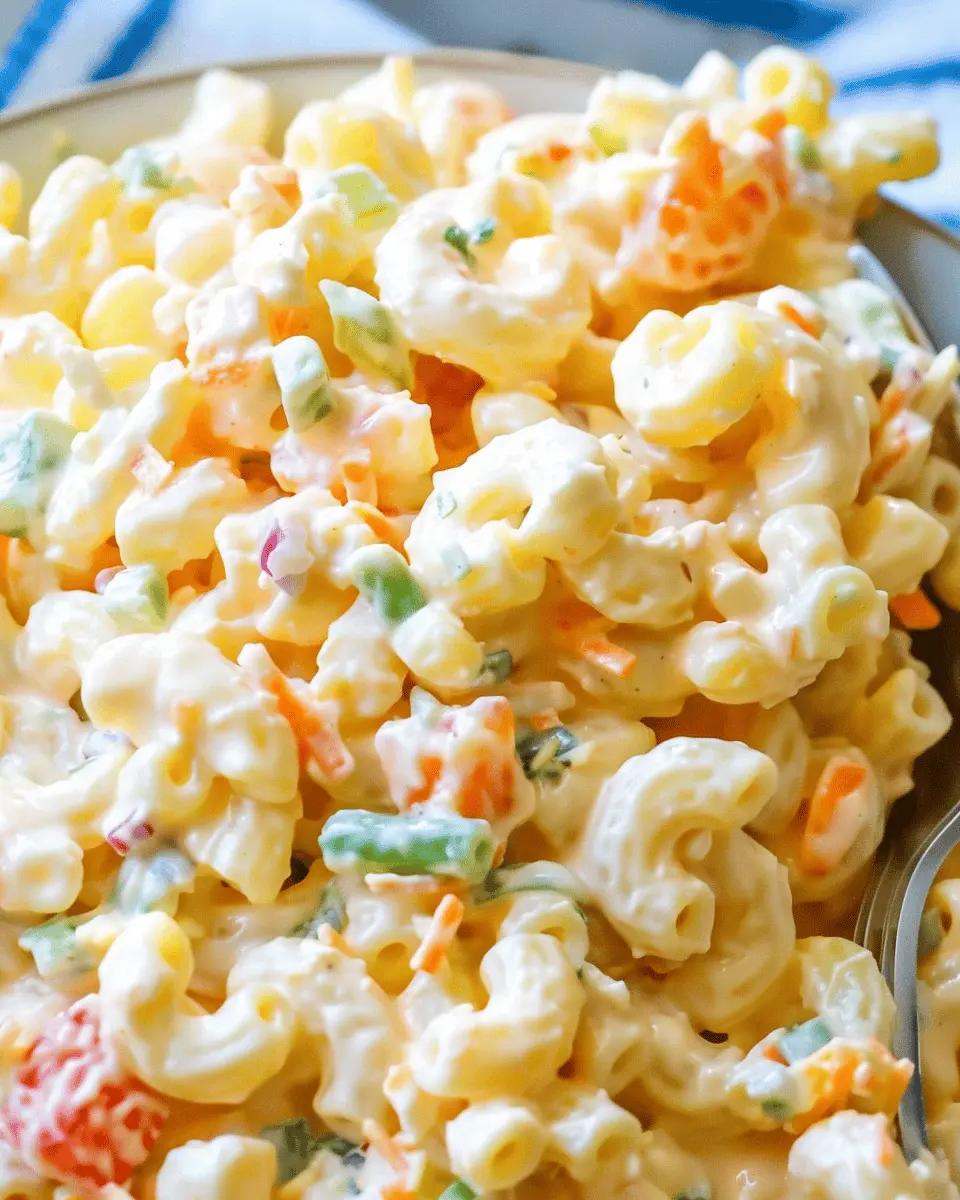 - In a Large Bowl: Combine the cooled macaroni, chopped vegetables, and dressing.
