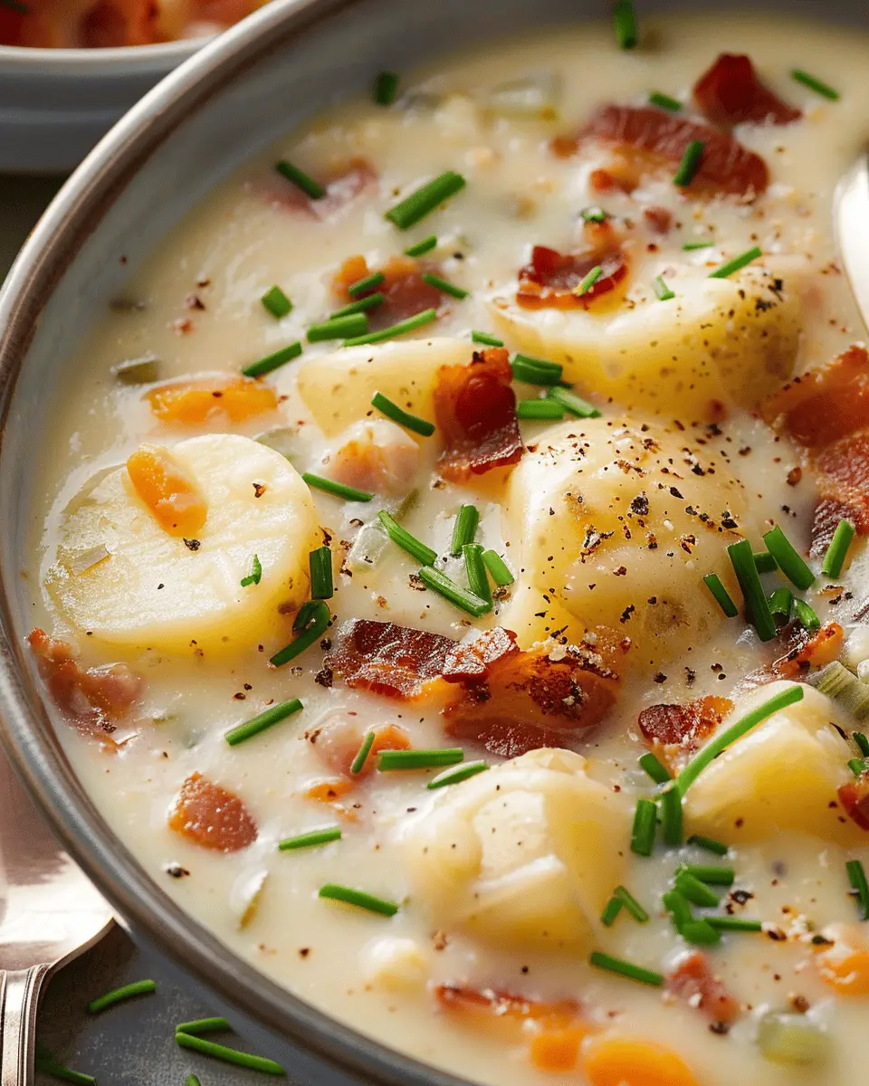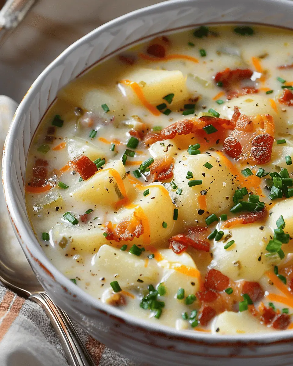 Now, it’s all about presentation. Serve your potato soup hot, garnished with your favorite toppings like shredded cheese, green onions, or a sprinkle of parsley for extra flair.