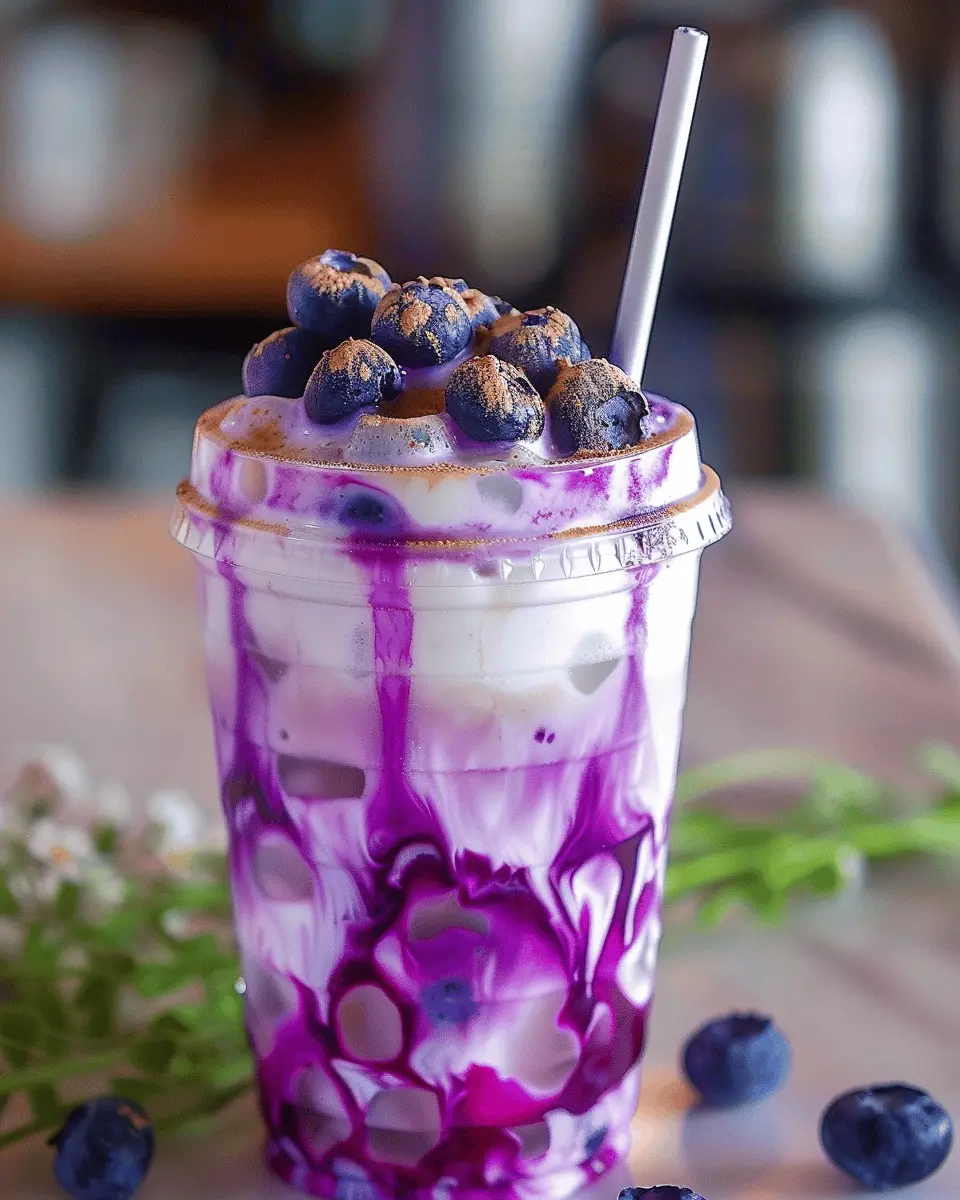 A delightful and refreshing iced blueberry latte perfect for coffee lovers.