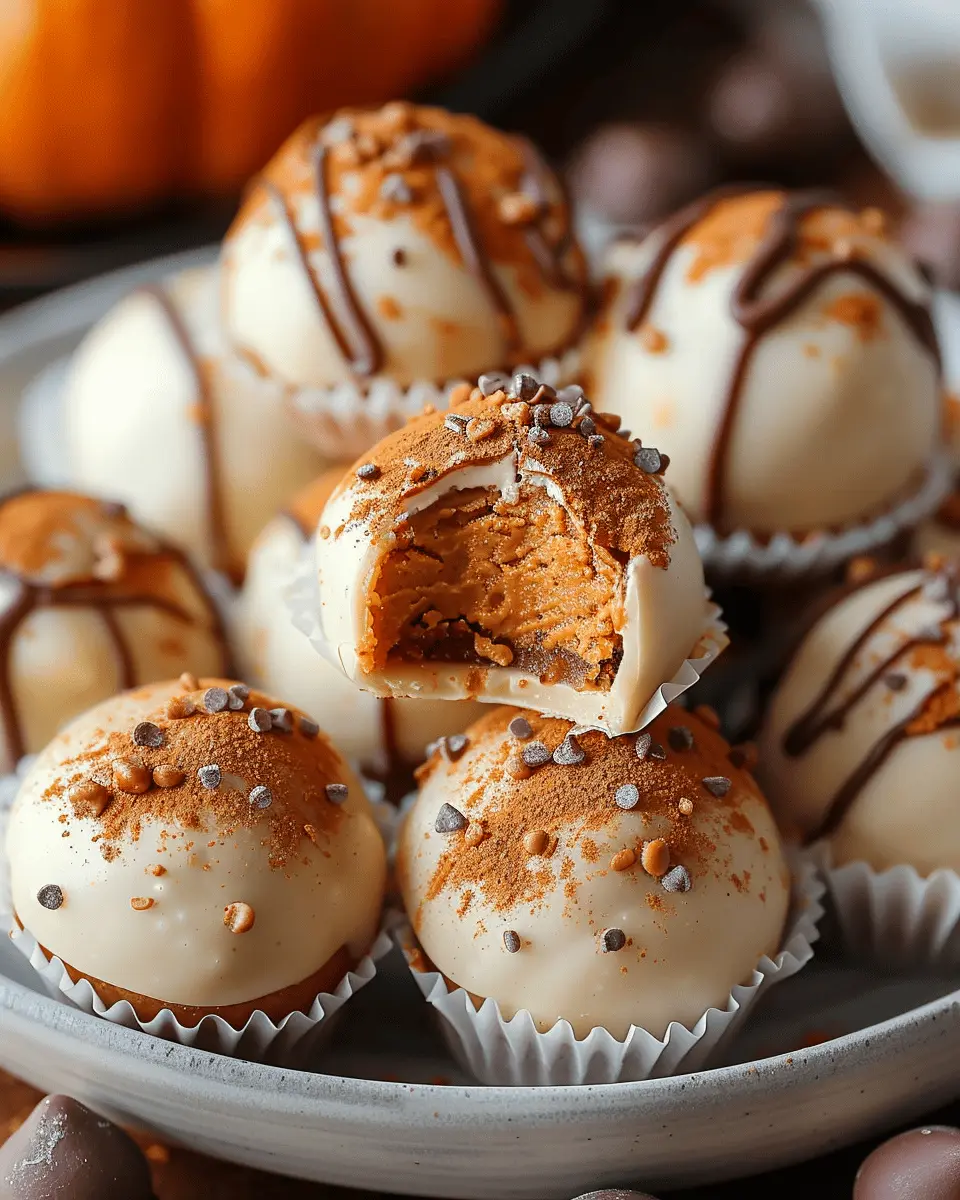 Indulge in the delightful flavors of fall with these Pumpkin Cheesecake Truffles, perfect for a sweet treat.