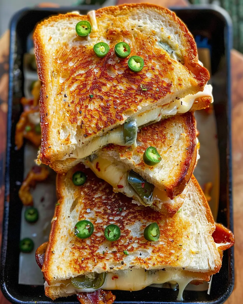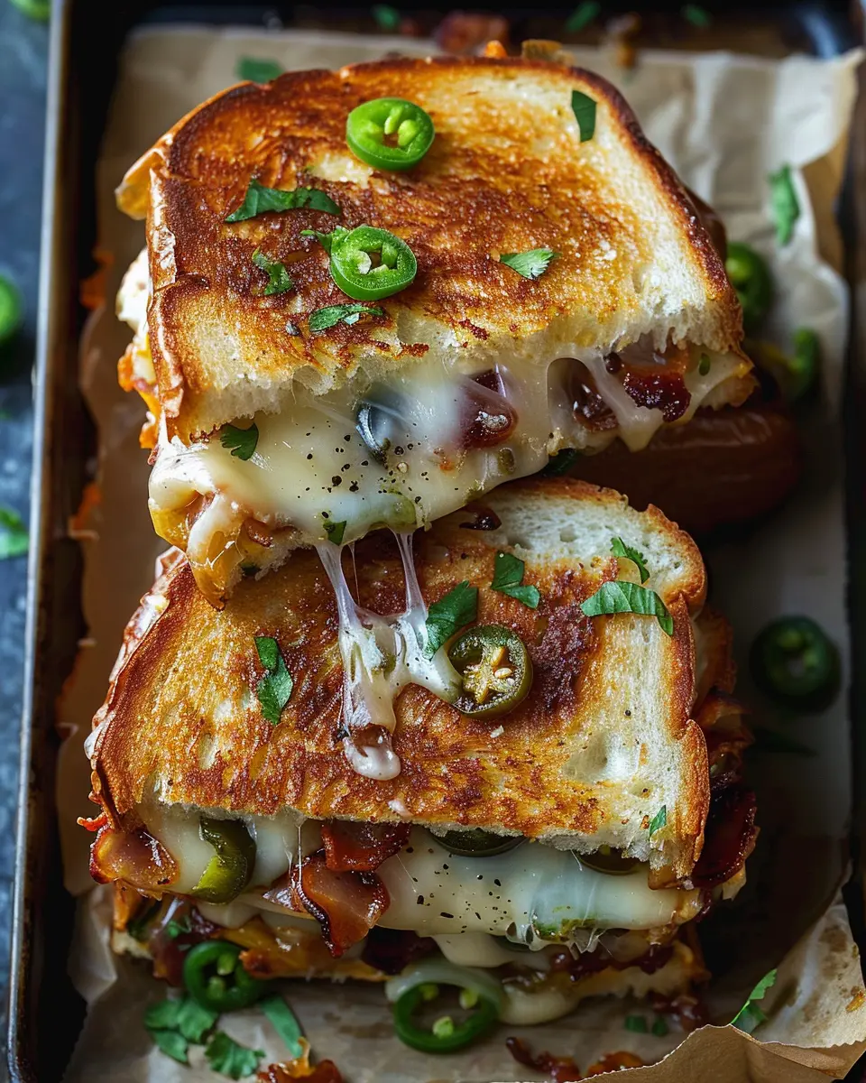 A delightful grilled cheese sandwich infused with roasted jalapenos and turkey bacon for an indulgent twist.