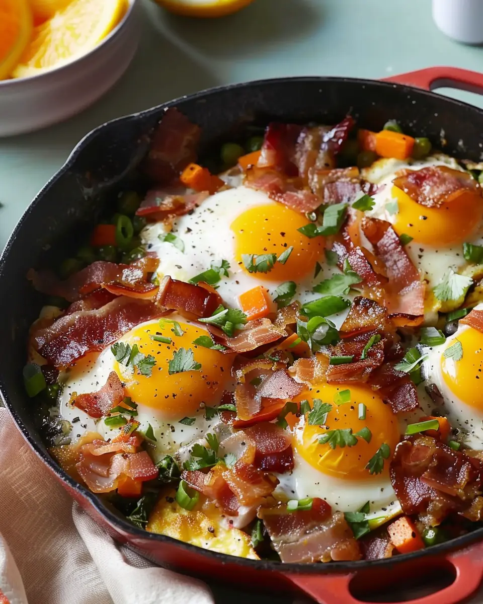 A delicious twist on a classic breakfast skillet featuring turkey bacon and a medley of vegetables.