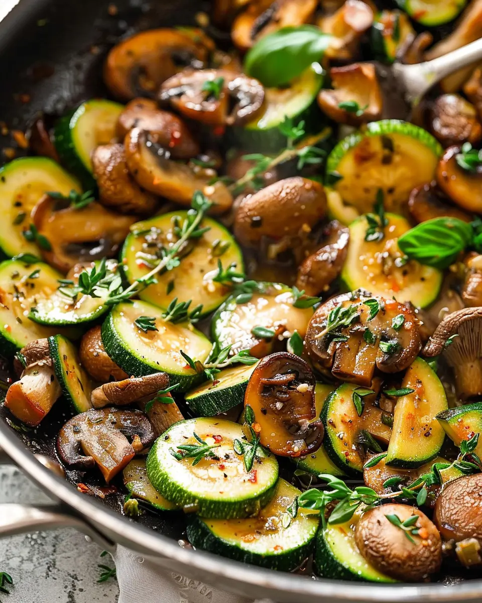 Absolutely! Making your skillet zucchini and mushrooms vegan is super easy. Simply substitute any animal-based products with plant-based alternatives. For instance, you can use olive oil or coconut oil for sautéing, and replace Turkey Bacon with mock bacon or skip it entirely for a lighter version. You might also consider adding some nutritional yeast to give your dish a cheesy flavor without the dairy. Fresh herbs like basil and parsley can elevate the dish without any animal products, adding layers of flavor and freshness.