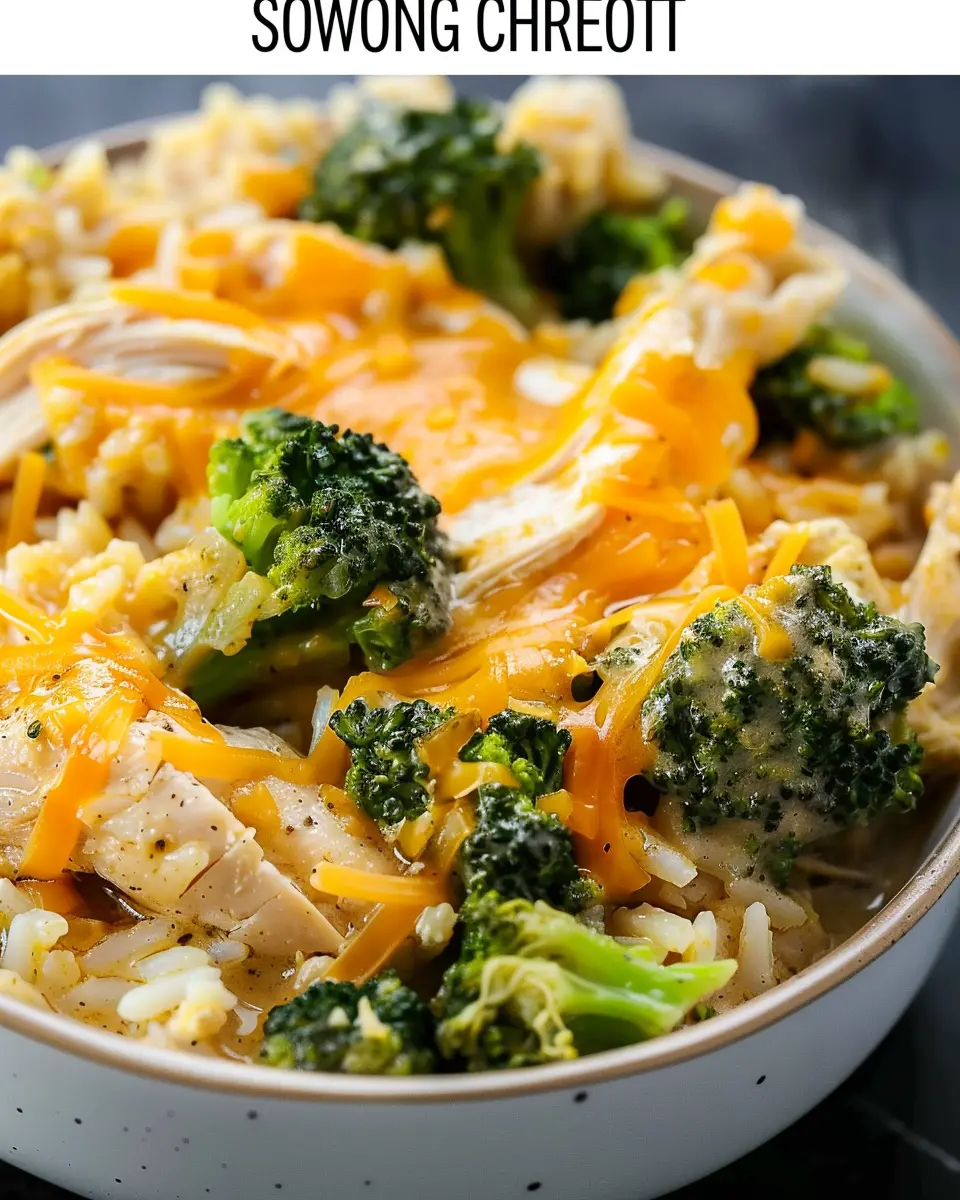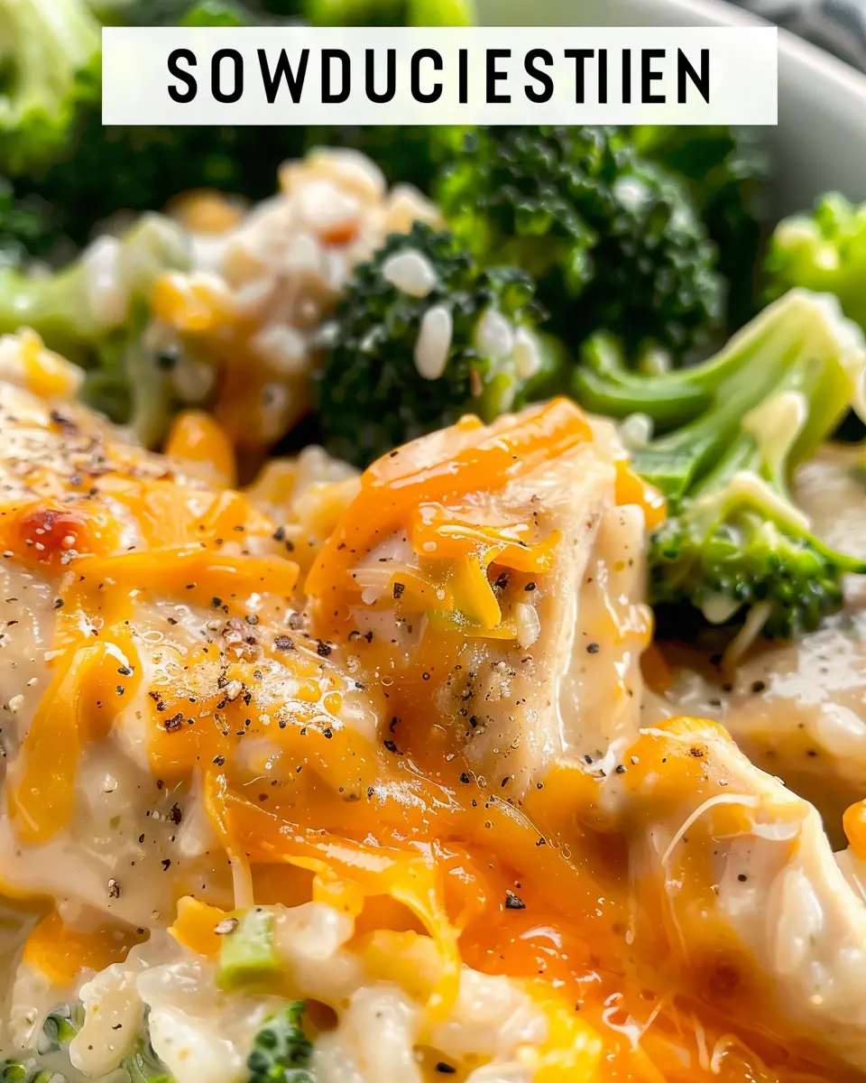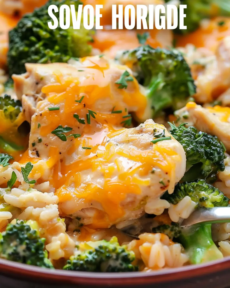 A hearty and flavorful meal combining tender chicken, fluffy rice, bright broccoli, and melted cheddar cheese, all cooked slowly for a perfect family dinner.