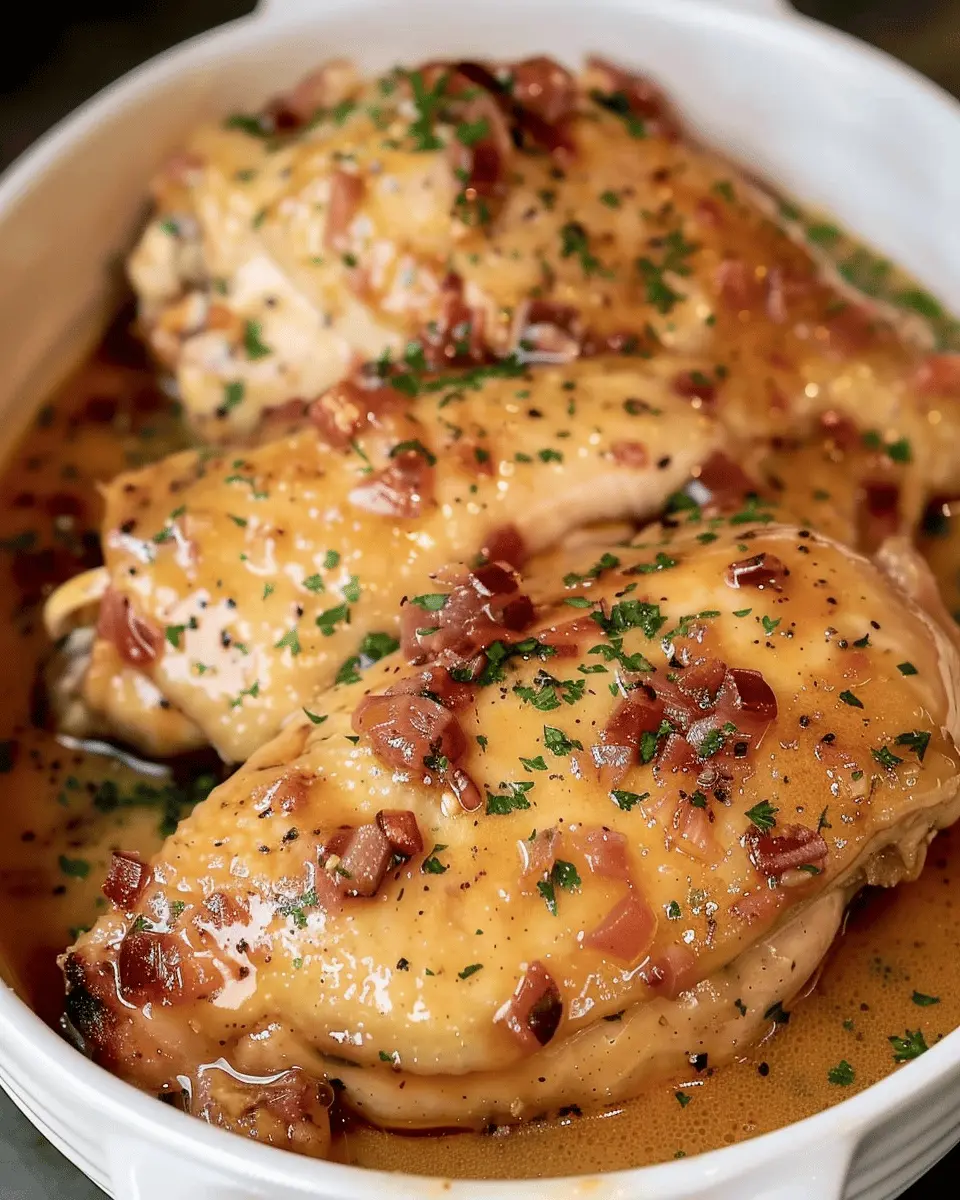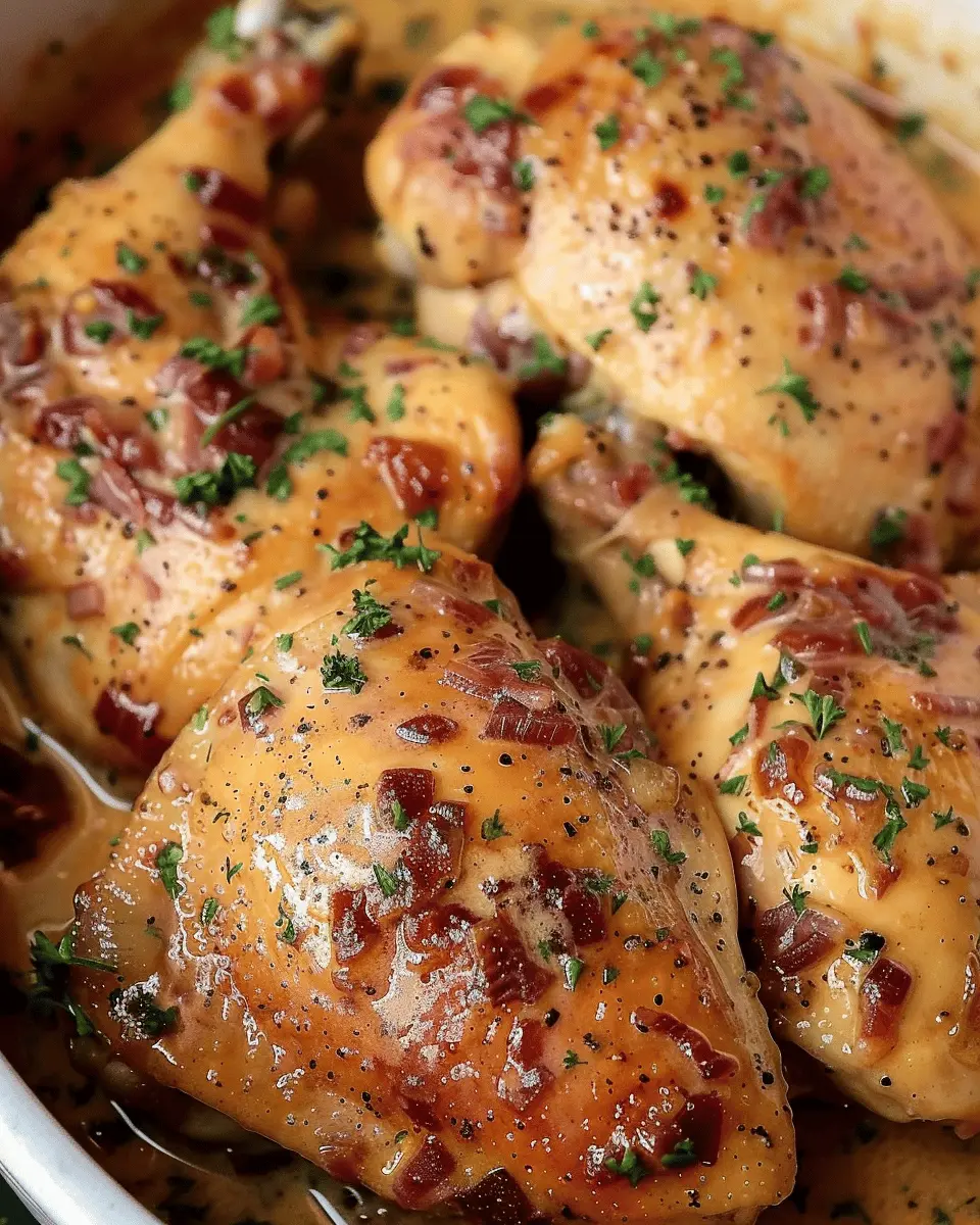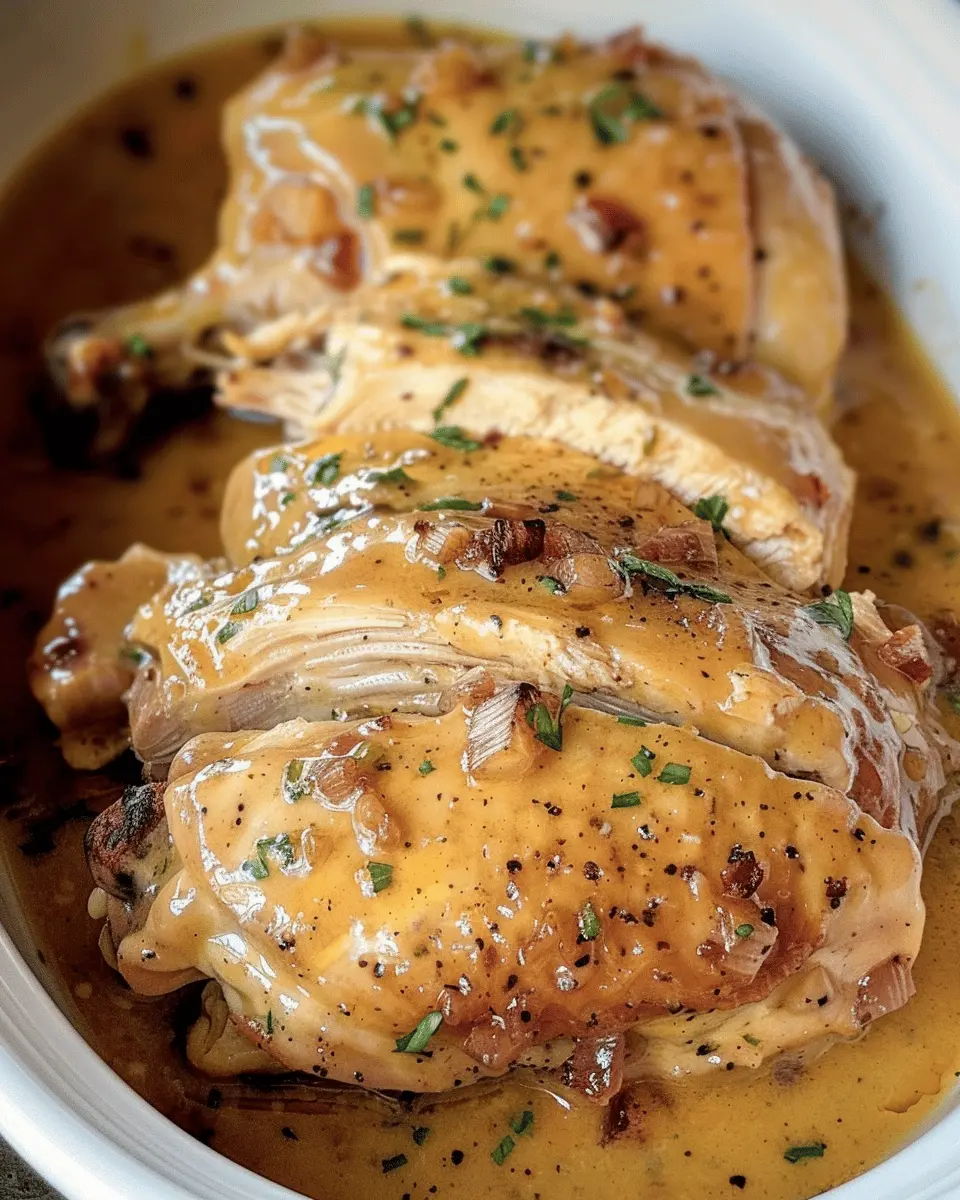 A comforting and indulgent slow cooker recipe featuring turkey bacon and tender chicken.