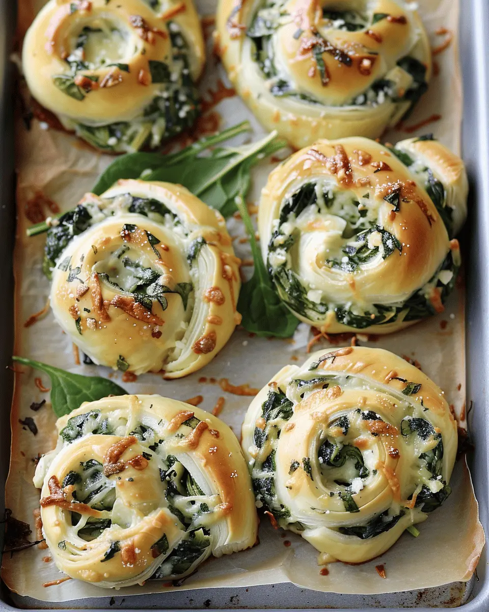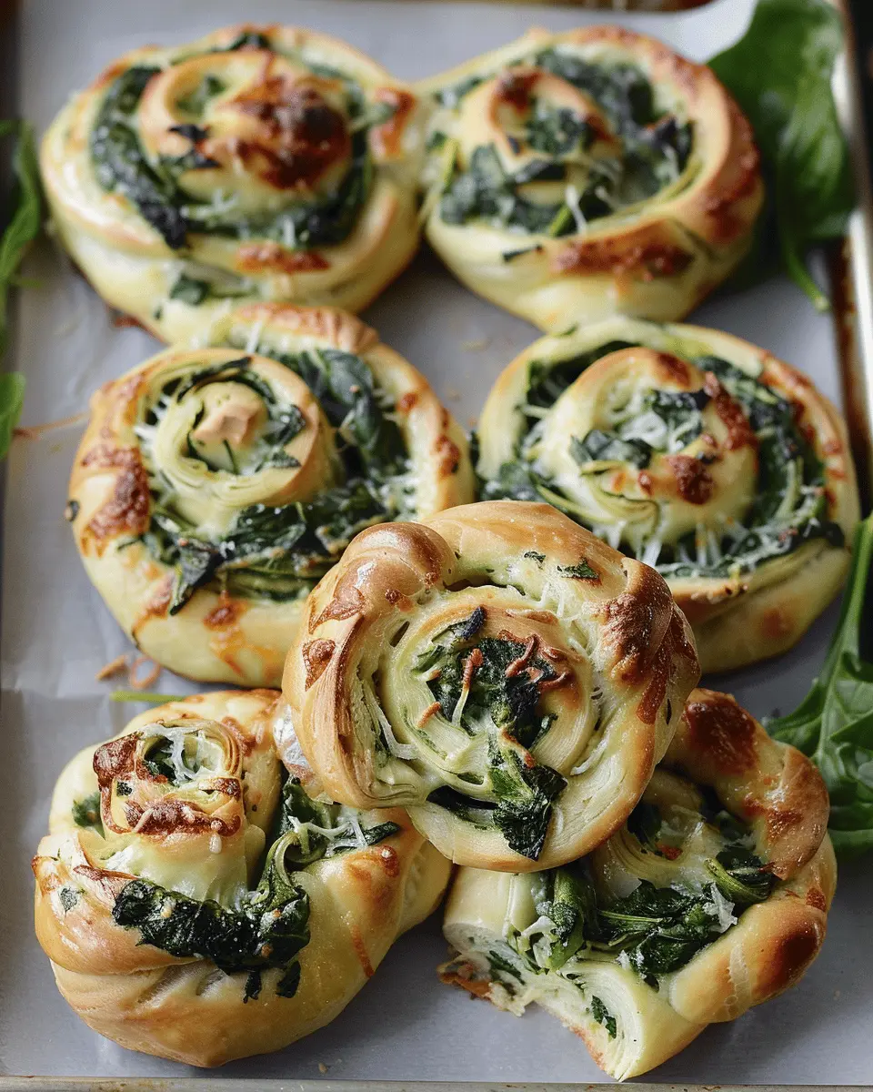 Finally, it’s time to bake your spinach artichoke swirls. Preheat your oven to 400°F (200°C) and line a baking sheet with parchment paper—this will help prevent sticking. Place your swirls on the prepared sheet and bake for about 20 to 25 minutes or until they are golden and puffed.