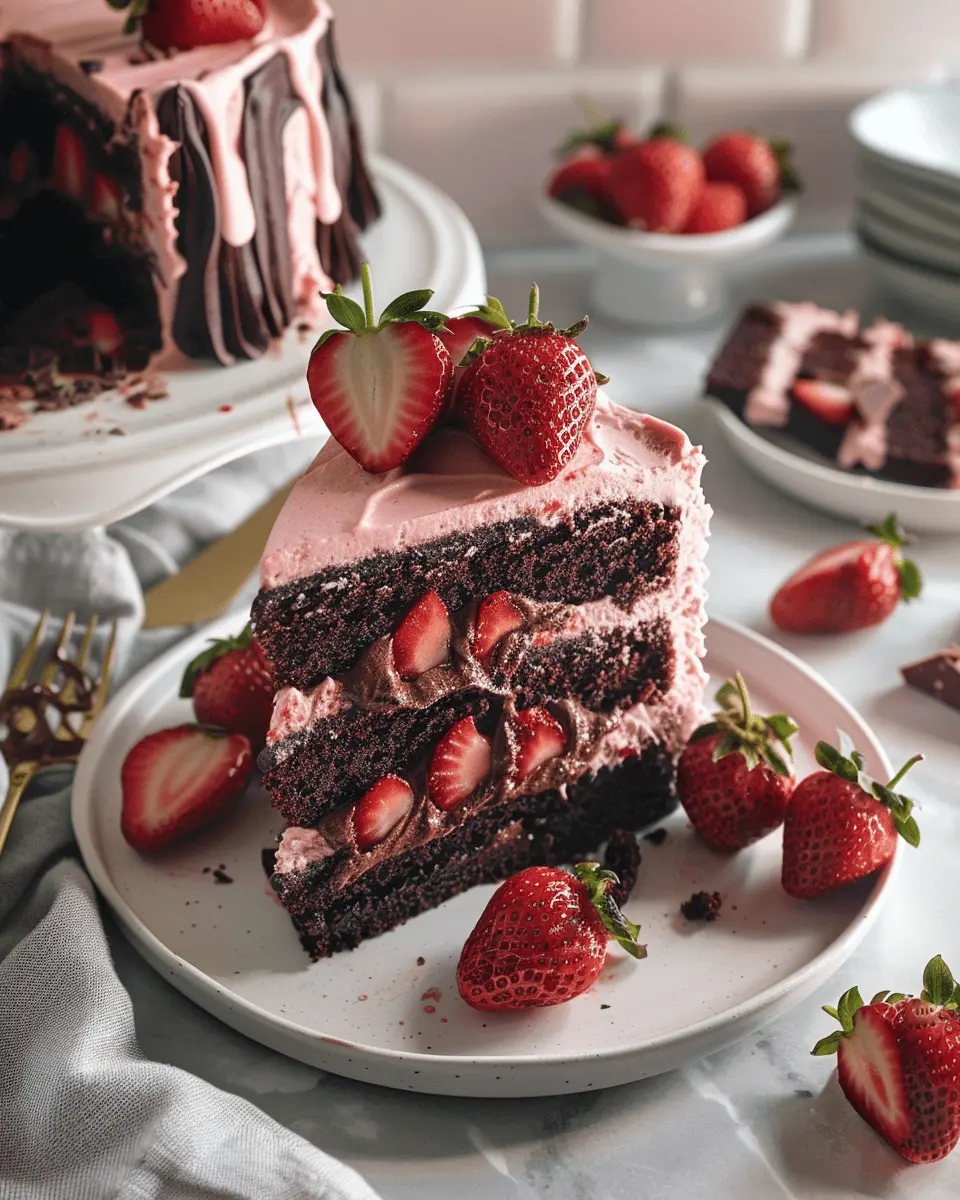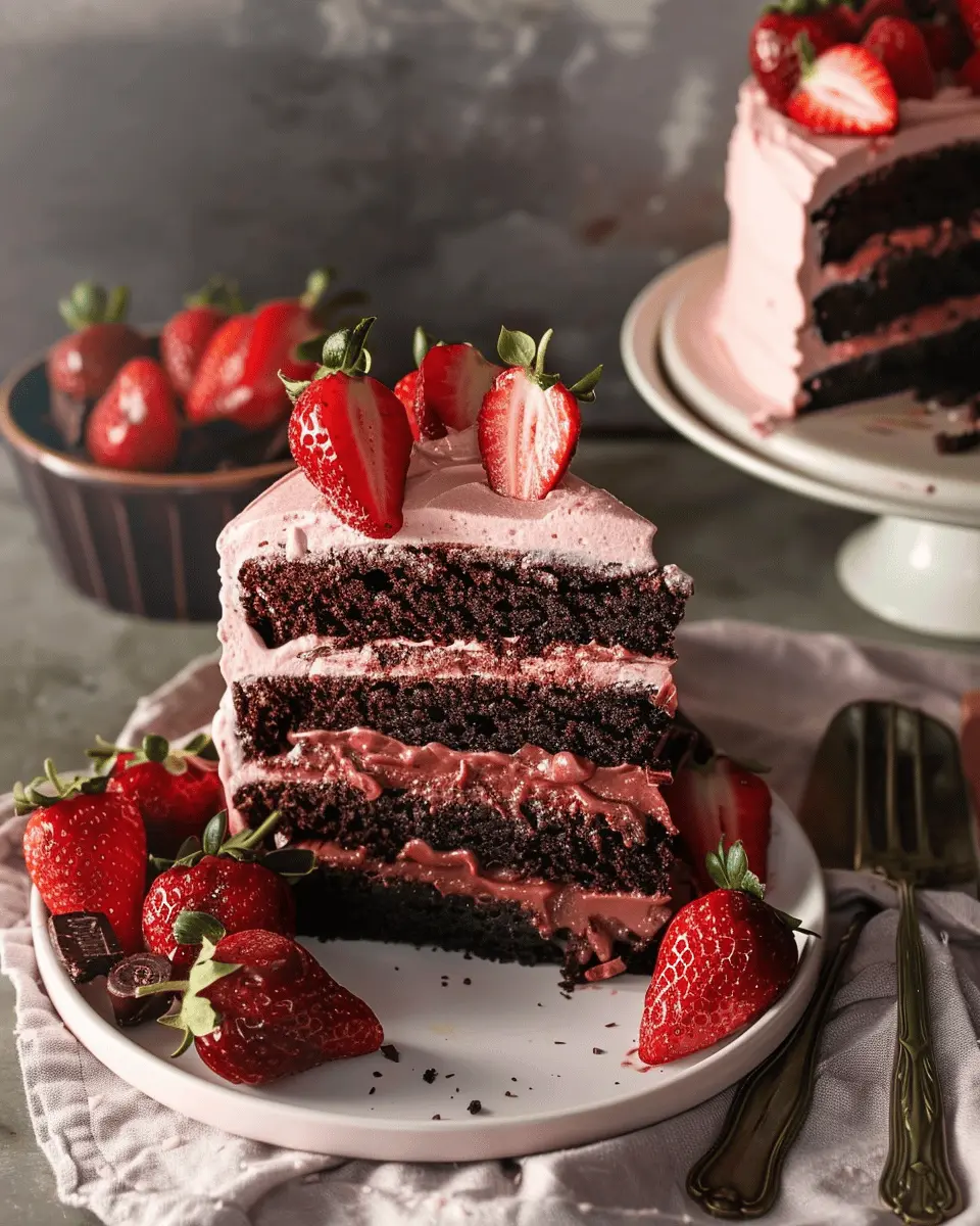 Textural Harmony: Imagine sinking your fork into a moist chocolate cake layered with creamy strawberry frosting. That contrast between the dense cake and light, airy frosting makes every bite feel luxurious.