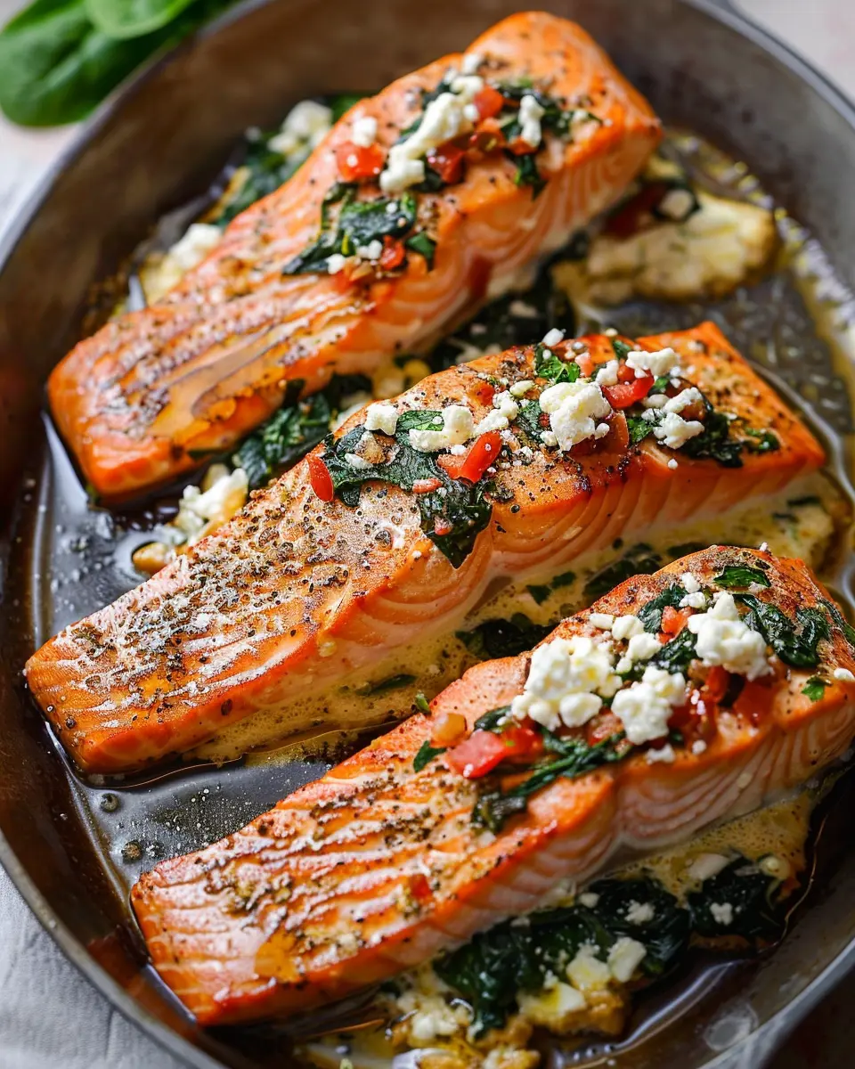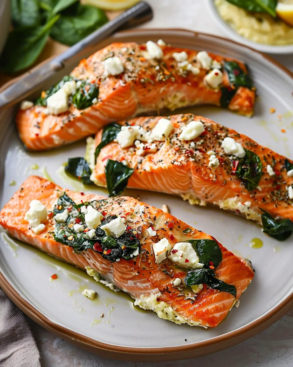 A delicious recipe for stuffed salmon featuring fresh spinach and feta cheese, perfect for a gourmet meal at home.