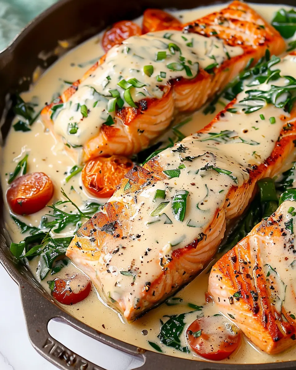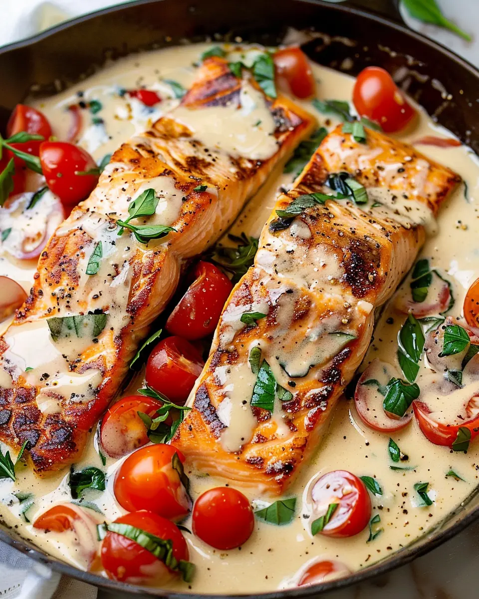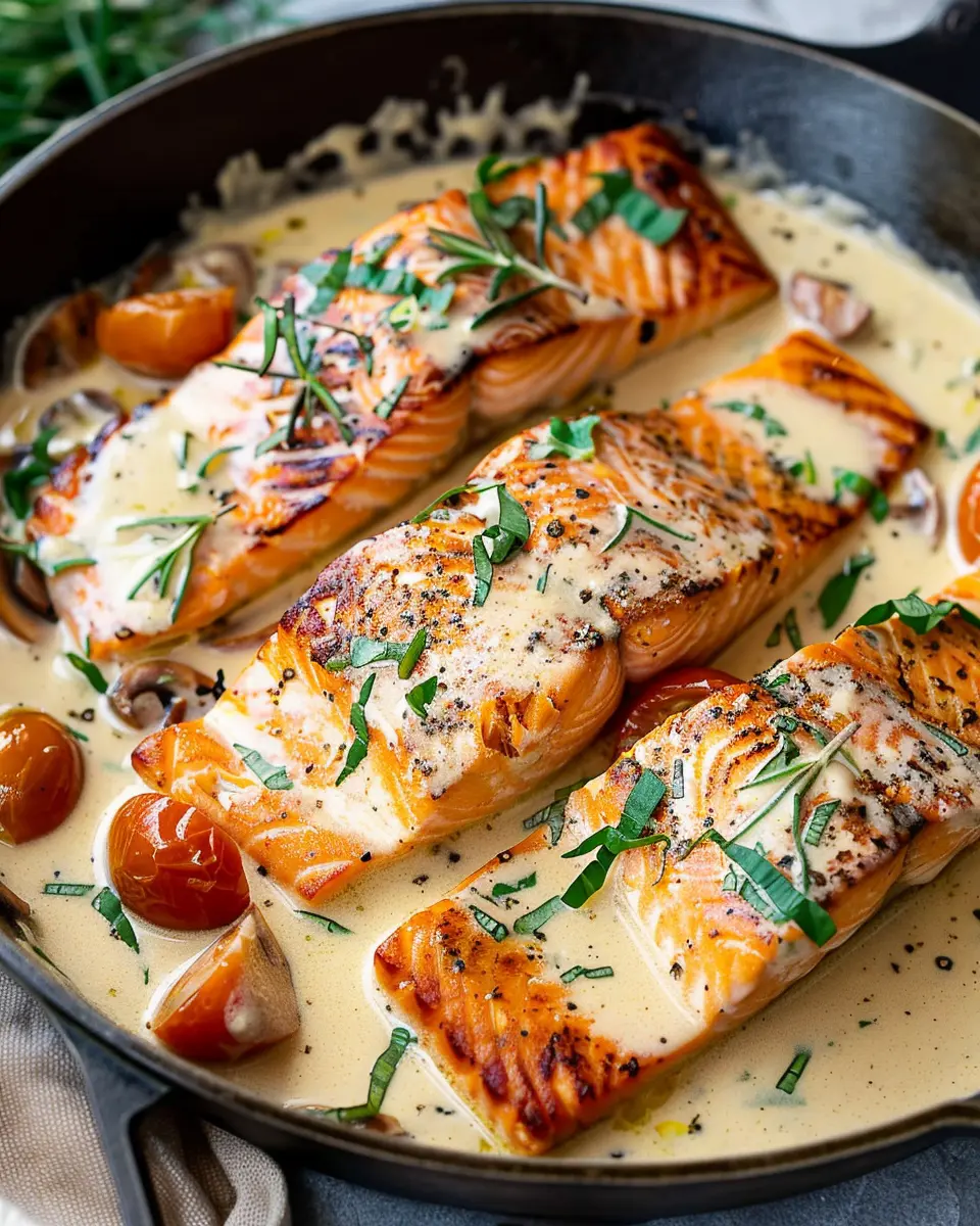 A deliciously rich dish of salmon fillets served in a creamy Parmesan sauce with Tuscan flavors.