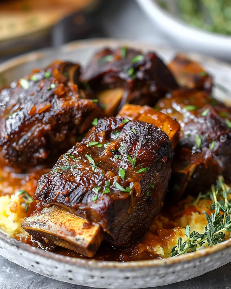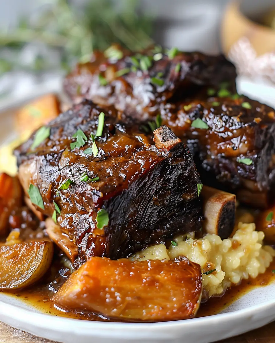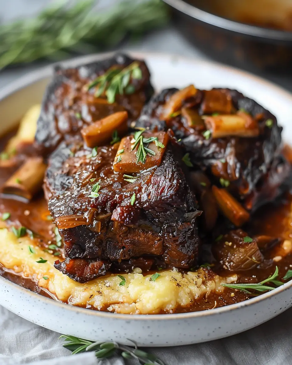 • Layering Technique: Start with a base of creamy mashed potatoes, then place your tender short ribs on top. Drizzle the sauce elegantly and sprinkle with fresh herbs.